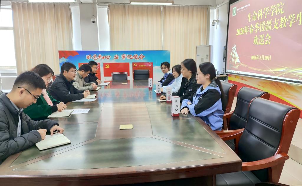 3月10日上午,生命科学学院在2220会议室举行2026年春季援疆支教学生欢送会。学院领导、辅导员及援疆支教实习学生参会。欢送会上,学院为即将启程的援疆支教同学送上精心准备的礼物。与会教师依次发言,从出行安全、生活安全、教学安全等多个维度提出具体要求,强调同学们需严格听从带队老师的指挥,遇到问题及时沟通反馈,确保支教工作平稳、顺利推进。随后,党委书记杨文涛发表讲话,充分肯定了支教同学们的奉献精神,并强调,赴疆学生需努力当好“三个角色”:一是教育的传递者,要充分发挥专业优势,将扎...