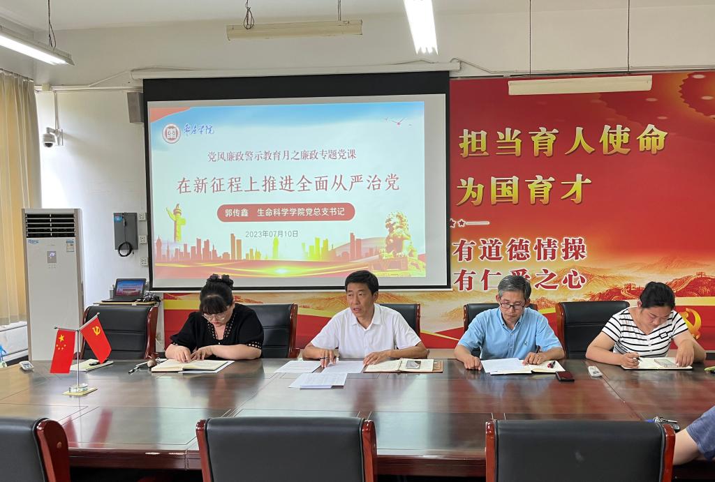 为深入推进学习贯彻习近平新时代中国特色社会主义思想主题教育,营造“以学正风”的政治生态,推进“廉洁文化月”活动深入开展,7月10日,生命科学学院开展党风廉政主题学习,党总支书记郭传鑫主讲《在新征程上推进全面从严治党》廉政教育主题党课。