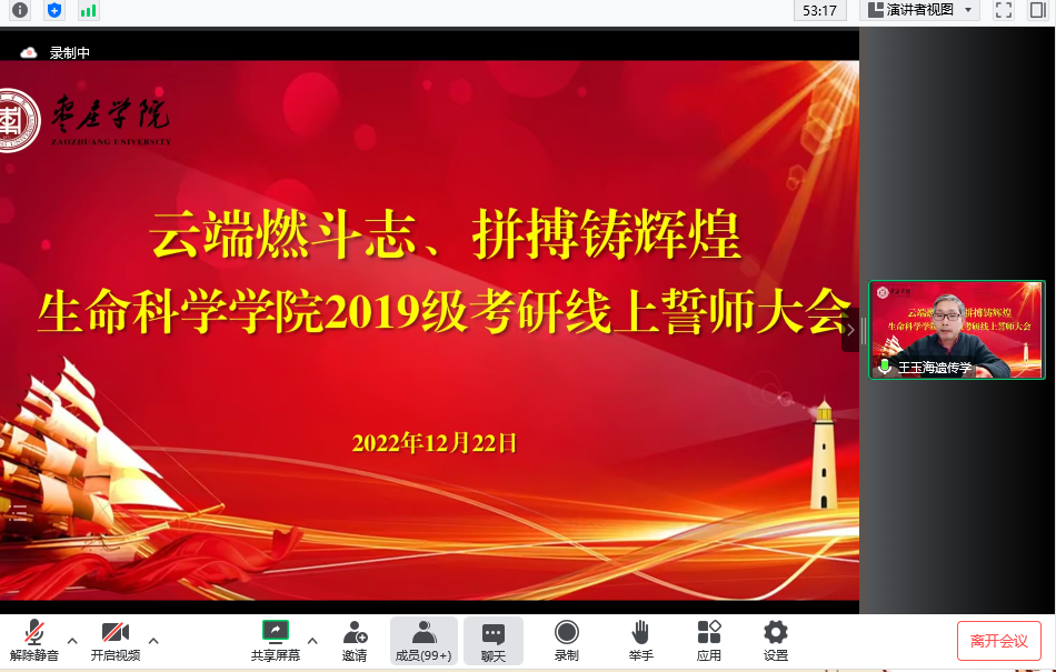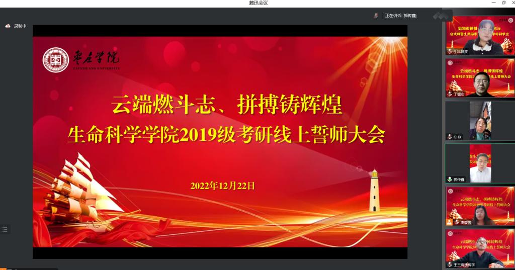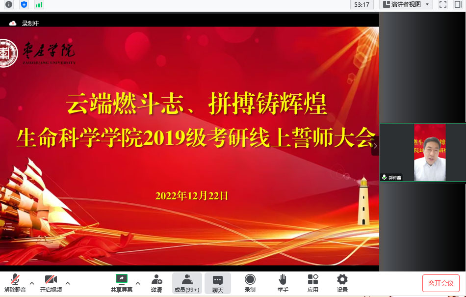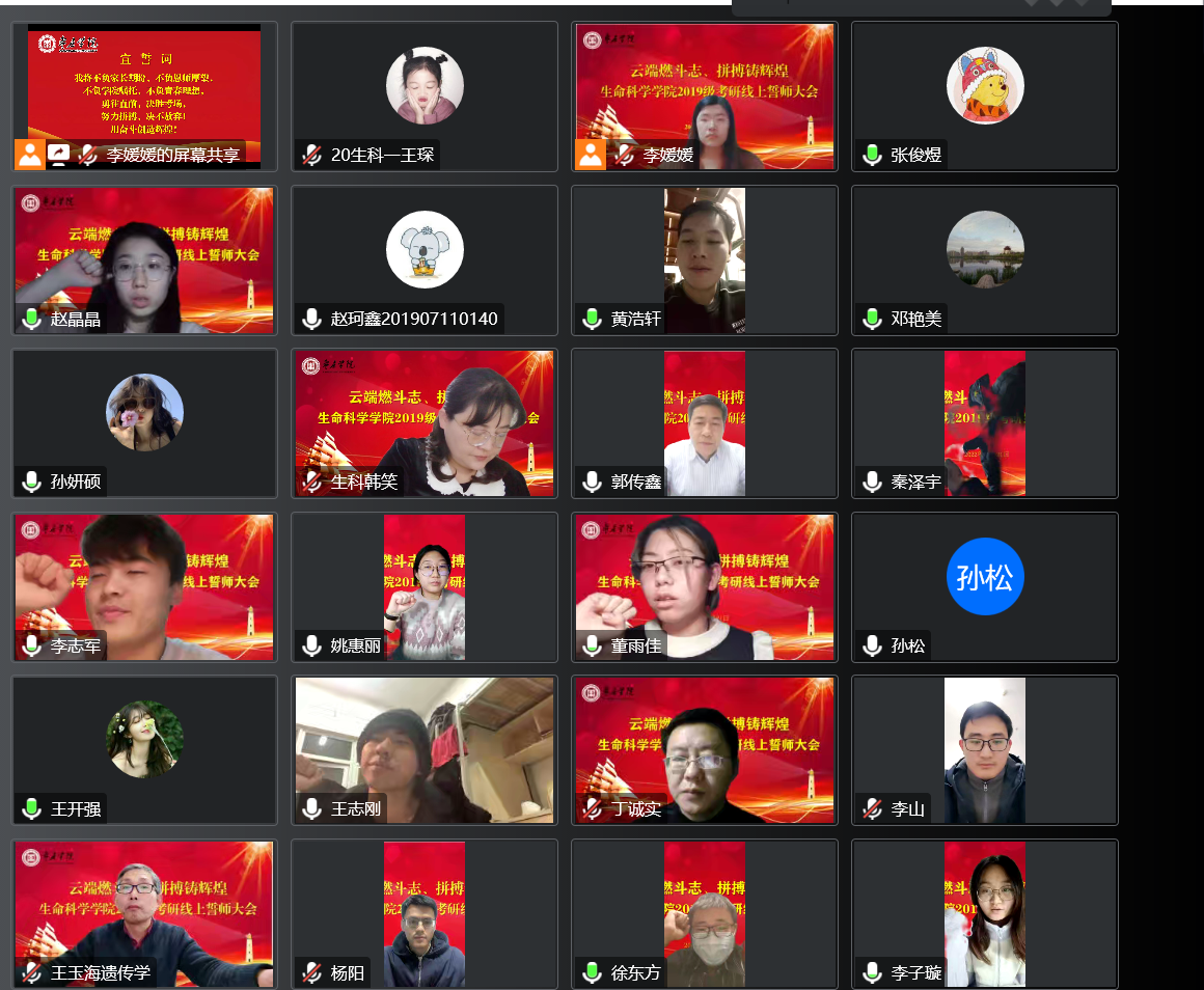 为帮助考研学子缓解考试焦虑,坚定考研信心。12月22日晚,生命科学学院隆重举行“云端燃斗志、拼搏铸辉煌”2019级考研线上誓师大会。学院党政领导、辅导员、19级班主任、各指导教师、2018级读研学长代表、家长代表、其他年级代表和全体2019级考研学子以“隔空对话、隔屏传情”的方式参加了活动。会议由党总支副书记韩笑主持。