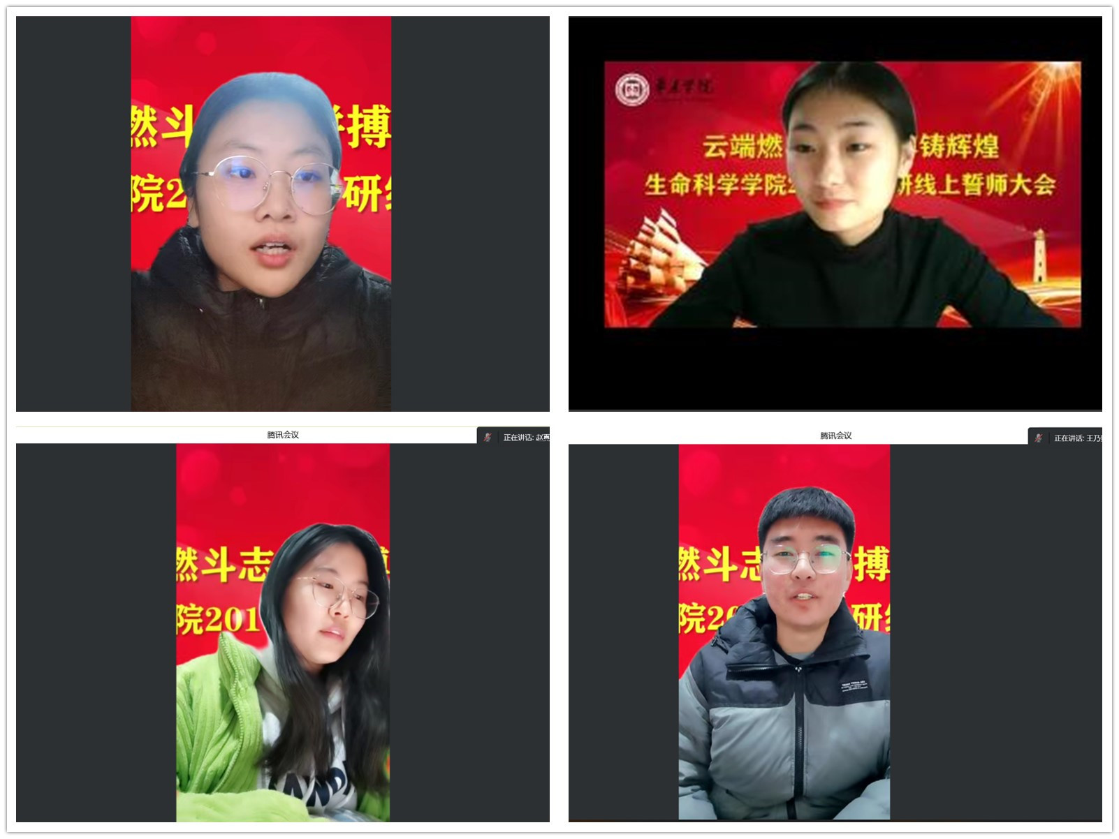 会议上,播放了来自在校生学弟学妹以及往届考研成功学长们的加油视频,2019级考研代表韩珂向学院领导老师的爱心与守护表达感谢,并表示会以此为动力,努力超越勇攀高峰。2018级已经就读研究生的赵真、王乃贺、魏丽娜学长深情回顾了自己的研路历程并为学弟学妹们呐喊助威。