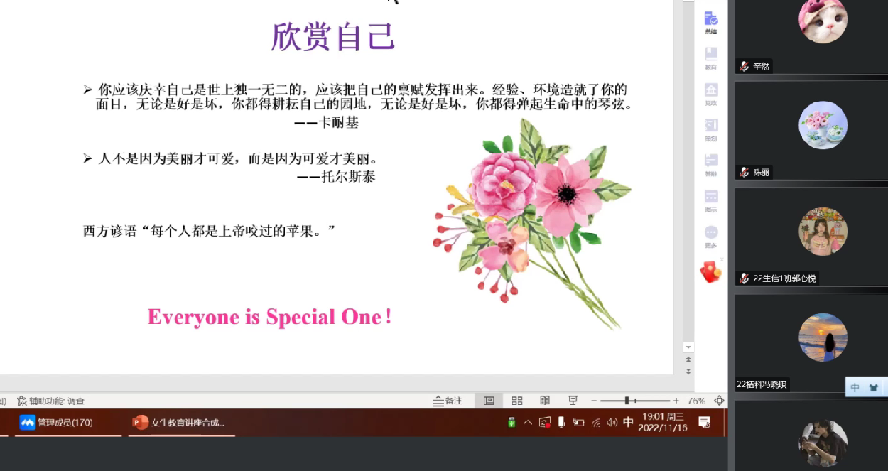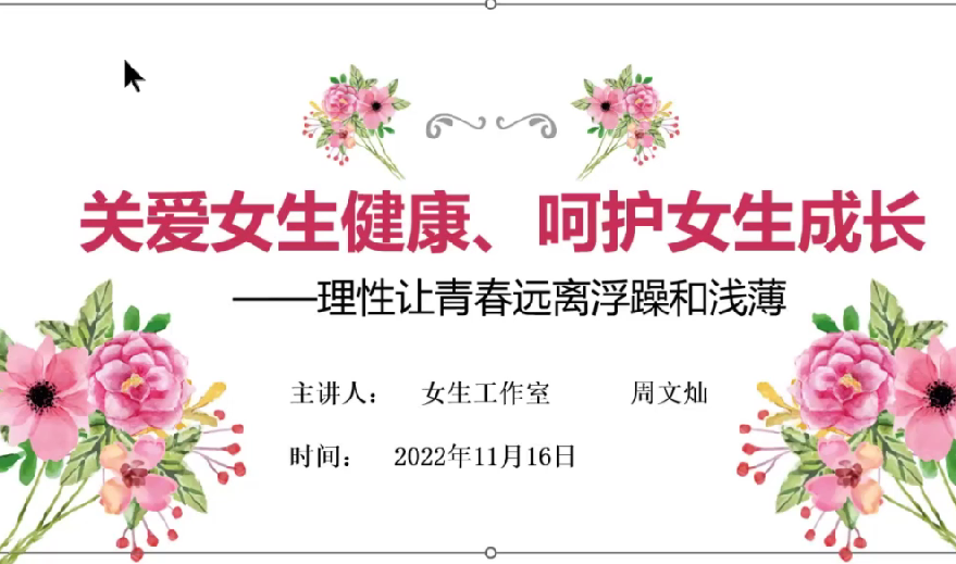 为普及女生健康知识,提高安全防范意识,促进身心健康发展,11月16日,生命科学学院通过腾讯会议形式举行了“关爱女生健康、呵护女生成长——理性让青春远离浮躁和浅薄”讲座活动。本次讲座由枣庄学院“呵护”女生教育辅导员工作室周文灿老师主讲,陈丽主持,2022级全体女生参加。