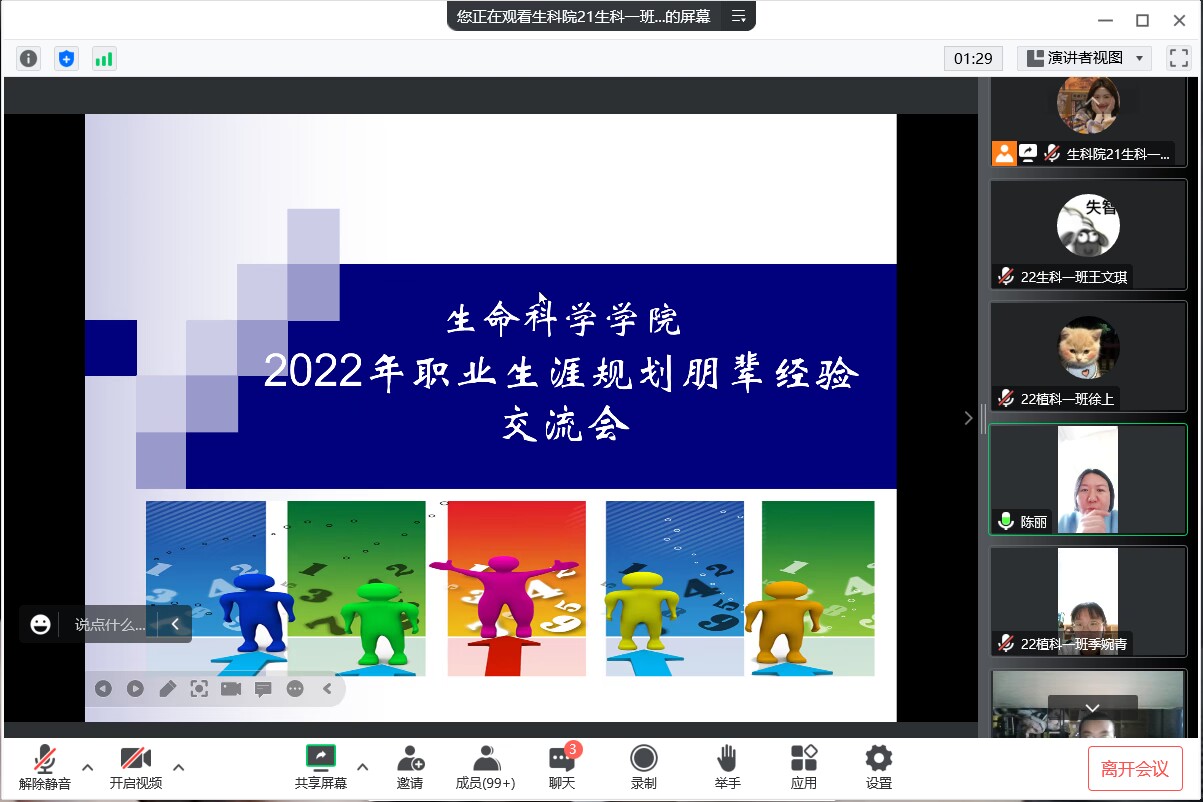 为培养我院新生对专业学习兴趣,明确大学学习和努力方向,生命科学学院于11月9日举办“职业生涯规划朋辈经验线上交流会。交流会邀请20级、19级在学习、实践活动等方面取得优异成绩的学生代表进行学习心得及大学感悟分享。2022级全体学生参加了分享会。