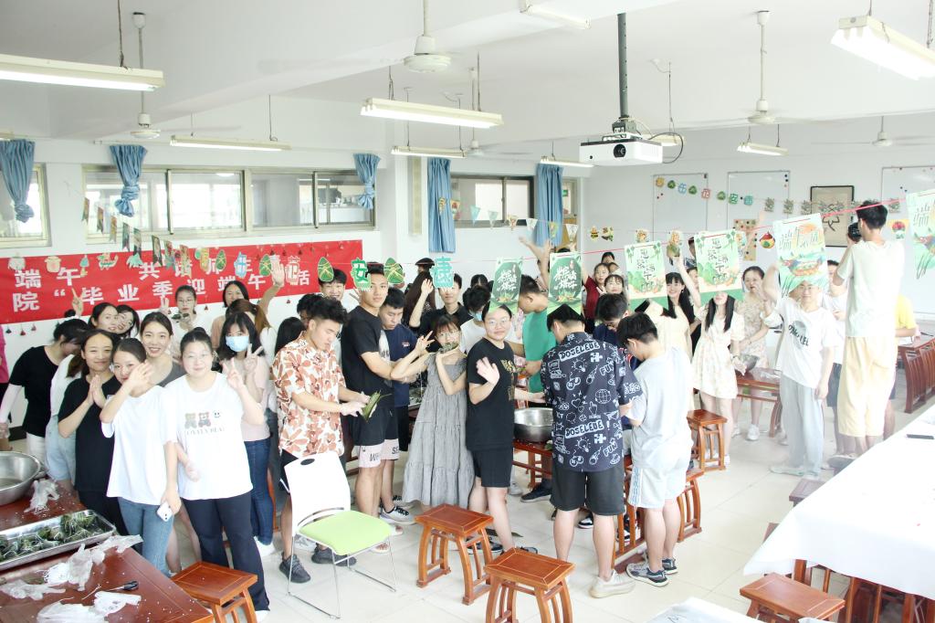 活动现场一片其乐融融,欢声笑语的景象,师生们围在一起共同包粽子,一片片清香的粽叶、一粒粒晶莹的糯米在老师和同学们的手中转眼变成了一个个诱人的粽子。虽然很多同学动作并不娴熟,是初次尝试,但是通过认真学习,迅速掌握了要领,学到了技能。活动结束后,包裹完的粽子被送到食堂加工蒸煮并派发每位同学,让参与的学生享受到自己的劳动果实。