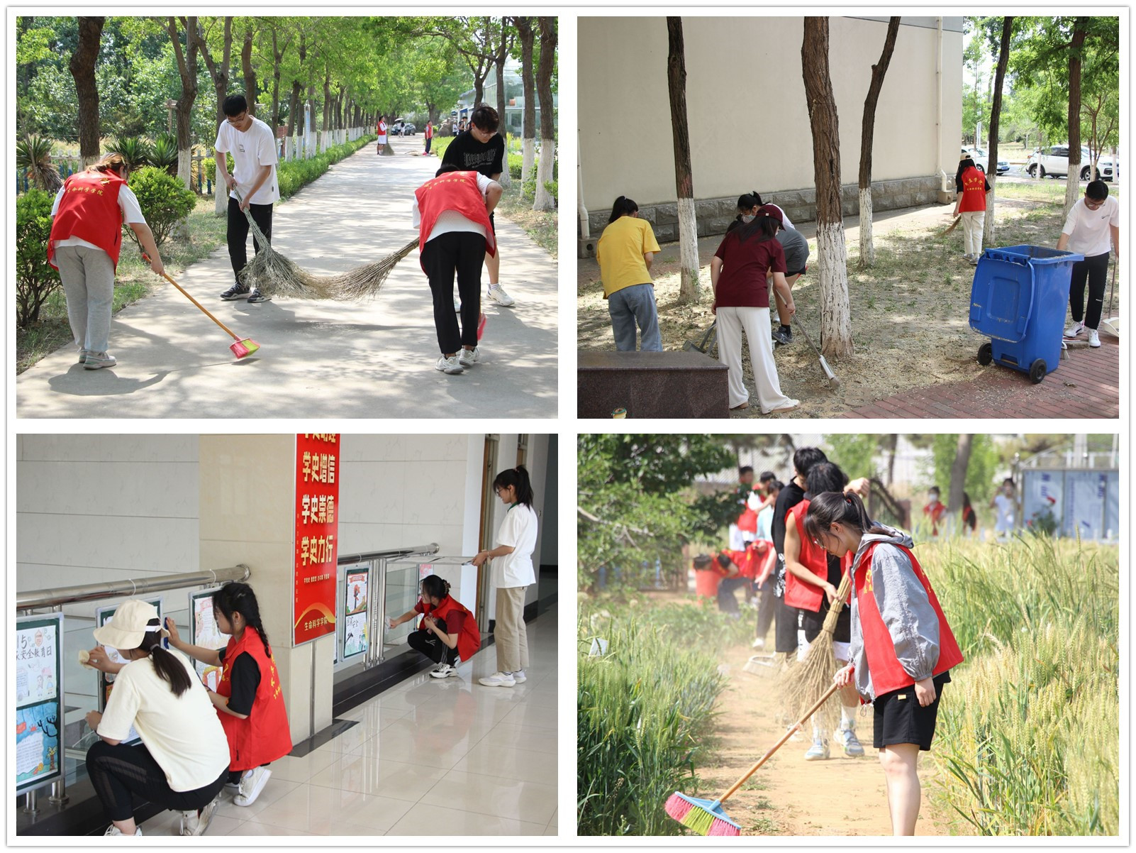 此次活动以学院环境卫生治理为主要内容,对教学楼内外、生物园地等开展卫生扫除。同学们合理分工,密切合作,手拿扫帚、拖把、簸箕等工具,对地面、宣传牌、绿化带等进行认真清理,有的拖地擦玻璃,有的喷洒消毒,有的打扫落叶,还有的清理卫生死角垃圾……经过大家的共同努力,校园面貌焕然一新。