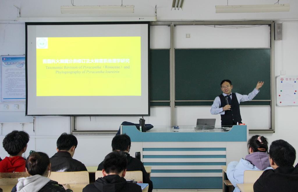 在本次报告会上,冯慧喆就蔷薇科火棘属分类修订及火棘谱系地理学研究的问题向同学们介绍火棘属系统的地位、属内关系以及火棘复合体分类、特点等。通过列举同学们熟悉的案例让同学们更好地了解了蔷薇科的有关知识。最后,冯慧喆对谱系地理学分析的研究结果作了简要总结。冯慧喆诙谐幽默的语言给同学们留下了深刻的印象,报告会中同学们认真听讲,积极记录,对植物分类新知识表现出了强烈兴趣。