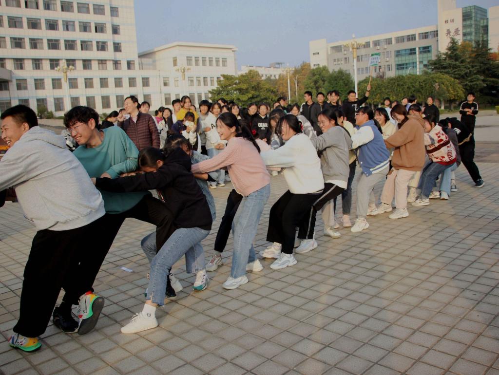 此次比赛共有三个项目,分别为拔河、1分钟集体跳绳、踢毽子。比赛采取积分制,总排名按照积分总数计算。在“踢毽子”比赛中同学们身轻如燕,沉着稳重;“集体跳绳”比赛中,8个人团结协作、配合默契、反应灵敏;“拔河”比赛中,参赛的队员们步调一致,口号响亮,紧握长绳拼命往后拉!周边的老师、同学们组成的啦啦队大声呐喊加油,将现场的活动推向高潮。