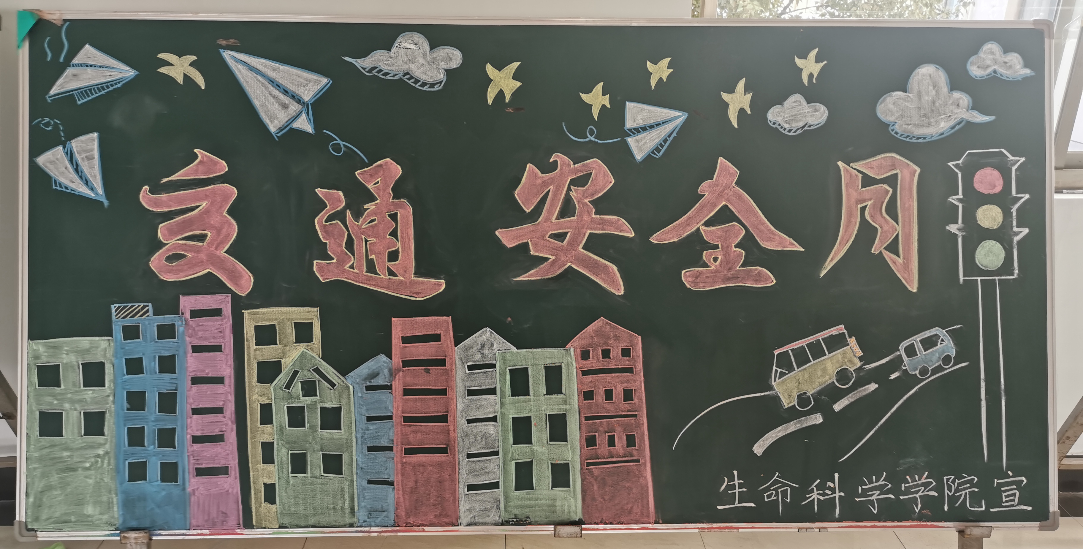 本次活动以“知危险会避险、安全文明出行”为主题,以第九个“全国交通安全日”为依托,开展了一系列内容丰富、形式多样的交通安全主题教育活动。如绘制了交通安全活动月的宣传板报,并通过网络知识科普的方式发布了两篇有关交通安全的微信推文。各班开展了交通安全主题班会,会后各班级组织开展了交通安全标语接力活动,并签署安全承诺书等。