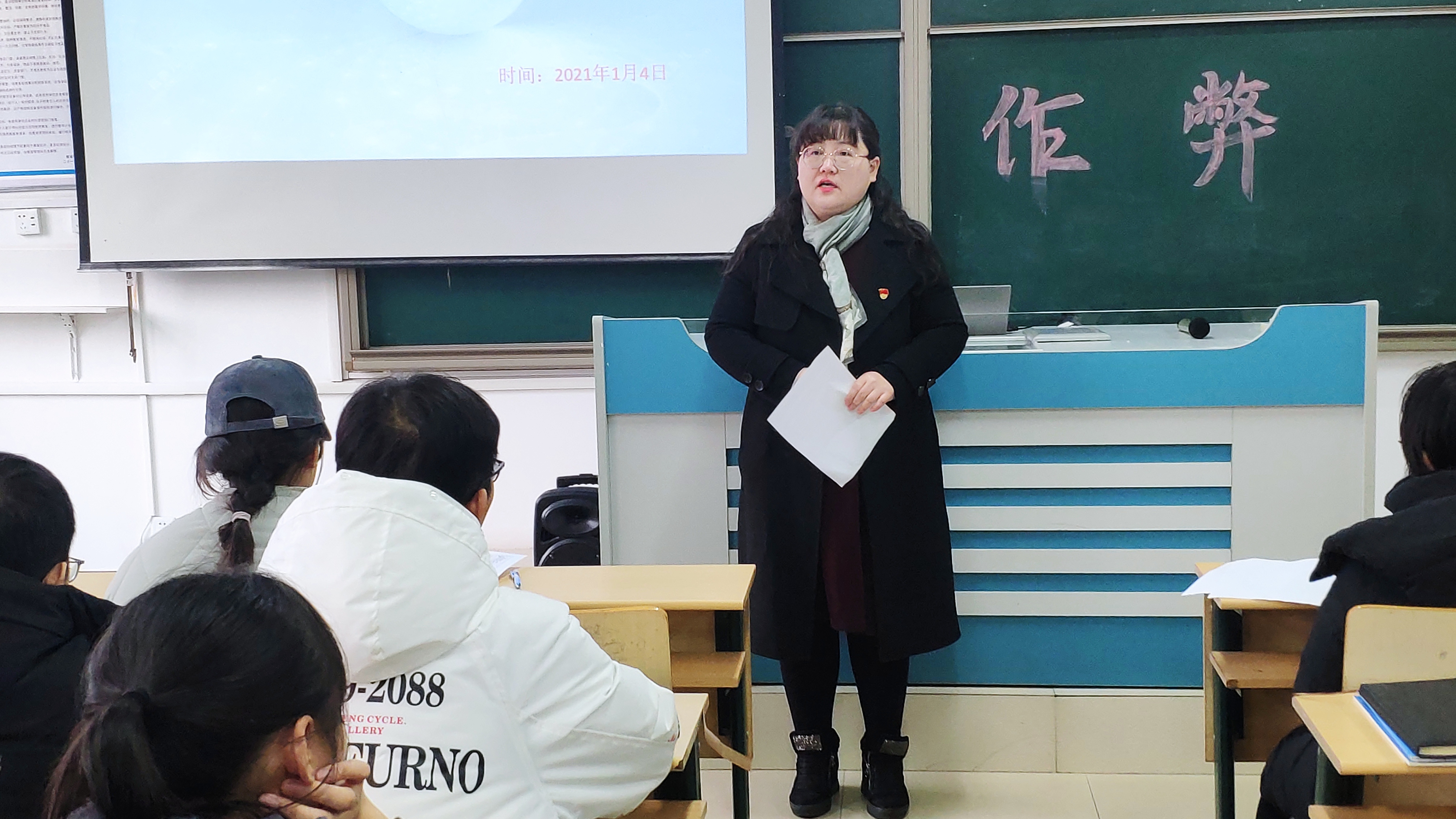 本次会议主要围绕诚信考试展开,重点强调了禁止考试作弊以及考试违纪的处理办法。韩笑强调了学风建设的重要性,要求学生保持良好的考试状态,诚信应考。并指出寒假离校安全问题,时刻做好疫情防控,减少假期聚会。陈丽用亲身经历告诫学生,要保持“宁可不考,不可作弊”的考试诚信态度,鼓励学生态度端正,认真备考。此外,优秀学生代表张景涛在班级中宣读了枣庄学院考场规则。