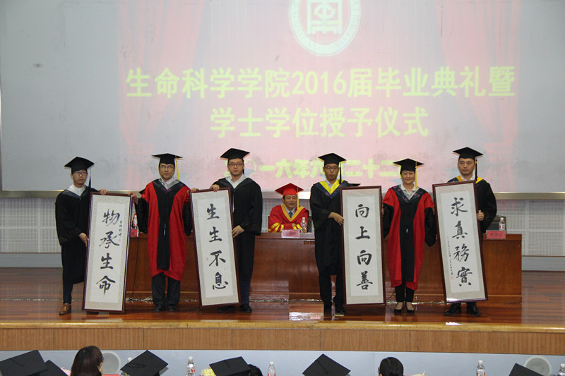 学士学位授予仪式之后,优秀毕业生张铭杰代表2016届全体毕业生向母校和辛勤培育了他们四年的老师表达了深深的谢意。满怀着感激之情、感恩之心,2016届毕业生向老师赠送鲜花,向学院赠送毕业生用心书写的“物承生命,生生不息,向上向善,求真务实”的生科精神。