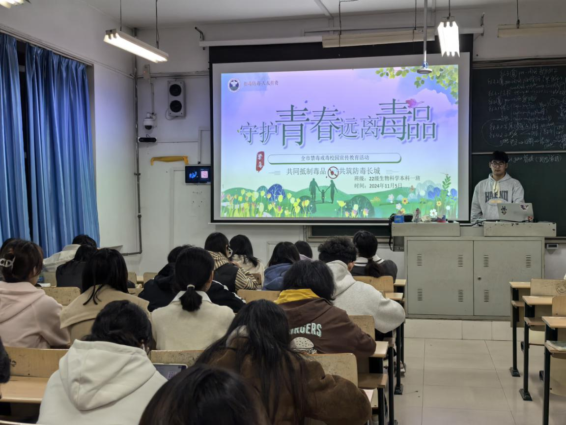 为深入贯彻落实国家禁毒宣传教育工作要求,增强学生识毒、防毒、拒毒意识,11月4日,枣庄学院生命科学学院组织各班级开展了以“守护青春,远离毒品”为主题的班会活动。本次班会旨在通过宣传教育,进一步增强学生的禁毒意识和自我保护能力,为构建健康、平安、和谐的校园环境奠定坚实基础。本次主题班会参与人员为生命科学学院各班学生,主持人为各班班长和团支部书记。