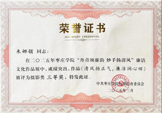 学生朱娜颔的摄影作品《清风扬正气,廉洁润心田》获摄影类三等奖。她聚焦校园荷塘,定格荷之绝美。画面里,荷叶如廉洁之网挡浊流,荷花似坚守底线的高洁人格。她以光影借景喻廉,让观者在赏景中感受廉洁精神的纯净力量。
