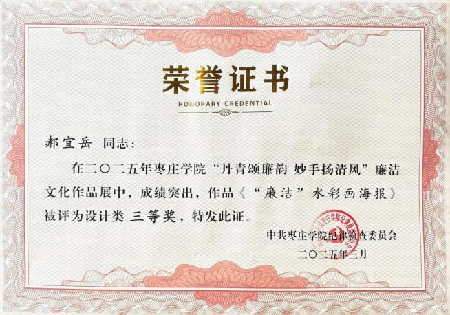 学生郝宜岳的设计类作品《“廉洁”水彩画海报》获设计类三等奖。她大胆运用清新水彩风格,将“廉洁”二字与象征廉洁的元素创意结合,色彩搭配和谐、视觉效果鲜明,展现出新时代大学生对廉洁文化的独特理解与创新表达。
