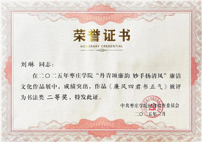 教师刘琳的书法作品《廉风四君书正气》脱颖而出,荣获书法类二等奖。她以笔为剑、以墨为锋,将“梅兰竹菊”四君子高洁品性与廉洁精神巧妙融合,笔锋刚劲洒脱、气韵生动,尽显传统书法艺术魅力与廉洁文化深厚底蕴。