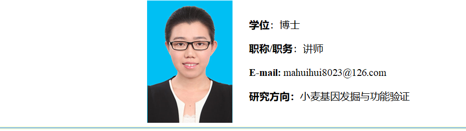 2019年6月毕业于中国农业科学院作物科学研究所,获得博士学位,同年进入枣庄学院生命科学学院工作。主讲《分子生物学》和《文献检索与论文写作》、《生物制品标准与法规》等多门课程。主要从事小麦背景下外源染色体特异标记开发、相关基因发掘与功能验证方面的研究。近年来参与国家级课题多项,在《The Crop Journal》、《Euphytica》等期刊发表SCI论文多篇。