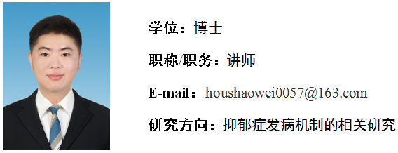 侯少伟,男,群众,2024年6月毕业于天津医科大学生物医学工程专业,获医学博士学位。2024年9月进入枣庄学院生命科学学院工作。主要从事抑郁症发病机制的相关研究。近年来以共同第一作者身份在《Frontiers in Public Health》、《Brain Research Bulletin》、《Biochemical Genetics》等学术期刊上发表论文多篇。