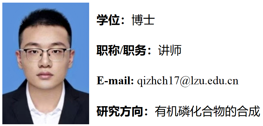 亓智超,男,中共党员。2023年6月毕业于兰州大学化学专业获得理学博士学位。同年加入兰州大学基础医学院博士后流动站开展博士后研究,于2025年11月出站。2026年1月进入枣庄学院生命科学学院工作,主要从事有机磷药物的相关研究。近年来在第一作者或者共同作者在《ACS Catal》、《Chem. Commun》、《J. Org. Chem》、《Chin. J. Org. Chem》等学术期刊上发表论文数篇。
