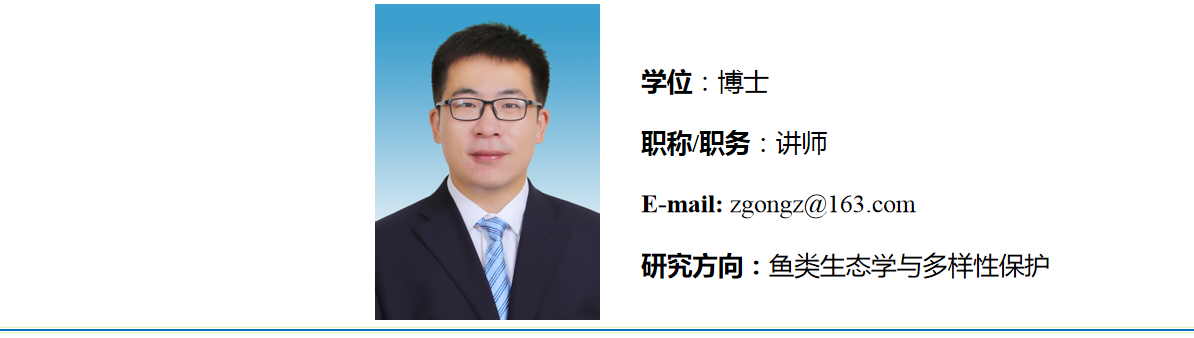2014年6月毕业于山东大学海洋生物资源与环境专业,获理学学士学位;2019年6月毕业于中国科学院水生生物研究所水生生物学专业,获理学博士学位。2019年7月至2020年10月,在水利部中国科学院水工程生态研究所任助理研究员;2020年11月至今,在枣庄学院生命科学学院任教。研究方向集中在淡水鱼类的生态适应、进化生物学及多样性保护。近年来在《Ecological Indicators》《Global Ecology and Conservation》《Zootaxa》及《湖泊科学》等国内外学术期刊上发表论文二十余篇,担任《Zootaxa》《Animals》《Journal of Vertebrate Biology》《水生生物学报》等学术期刊的审稿人。在校主讲《动物生物学》《生态学》《文献检索与论文写作》及《生物课件制作与应用》等课程。现主持山东省自然科学基金1项、教育部产学合作协同育人项目1项,参与国家自然科学基金3项。