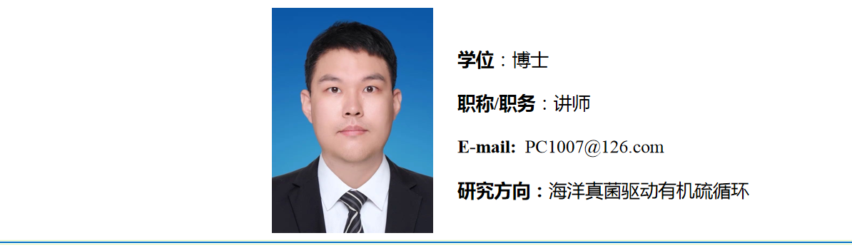 中共党员,2023年12月毕业于南京大学生物学专业,获理学博士学位。2024年6月进入枣庄学院生命科学学院工作。主要从事海洋真菌驱动有机硫循环的相关研究。近年来以第一作者身份在《Science of The Total Environment》、《iScience》、《BMC genomics》、《Frontiers in Microbiology》等学术期刊上发表论文多篇。