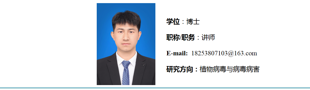 2023年6月毕业于山东农业大学植物病理学专业,获农学博士学位。2023年9月进入枣庄学院生命科学学院工作。主要从事植物病毒与病毒病害的相关研究。近年来以第一或共同作者身份在《Molecular Plant Pathology》、《Plant Disease》、《PLOS ONE》等学术期刊上发表论文多篇。
