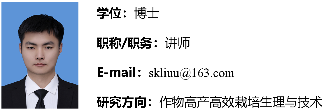 刘帅康,男,中共党员,2024年12月毕业于西北农林科技大学植物营养学专业,获农学博士学位。2025年2月进入枣庄学院生命科学学院工作。主要从事作物水氮高效利用栽培与耕作技术的相关研究。近年来以第一作者身份在《Agricultural Water Management》、《Soil & Tillage Research》、《麦类作物学报》等国内外学术期刊上发表多篇论文。