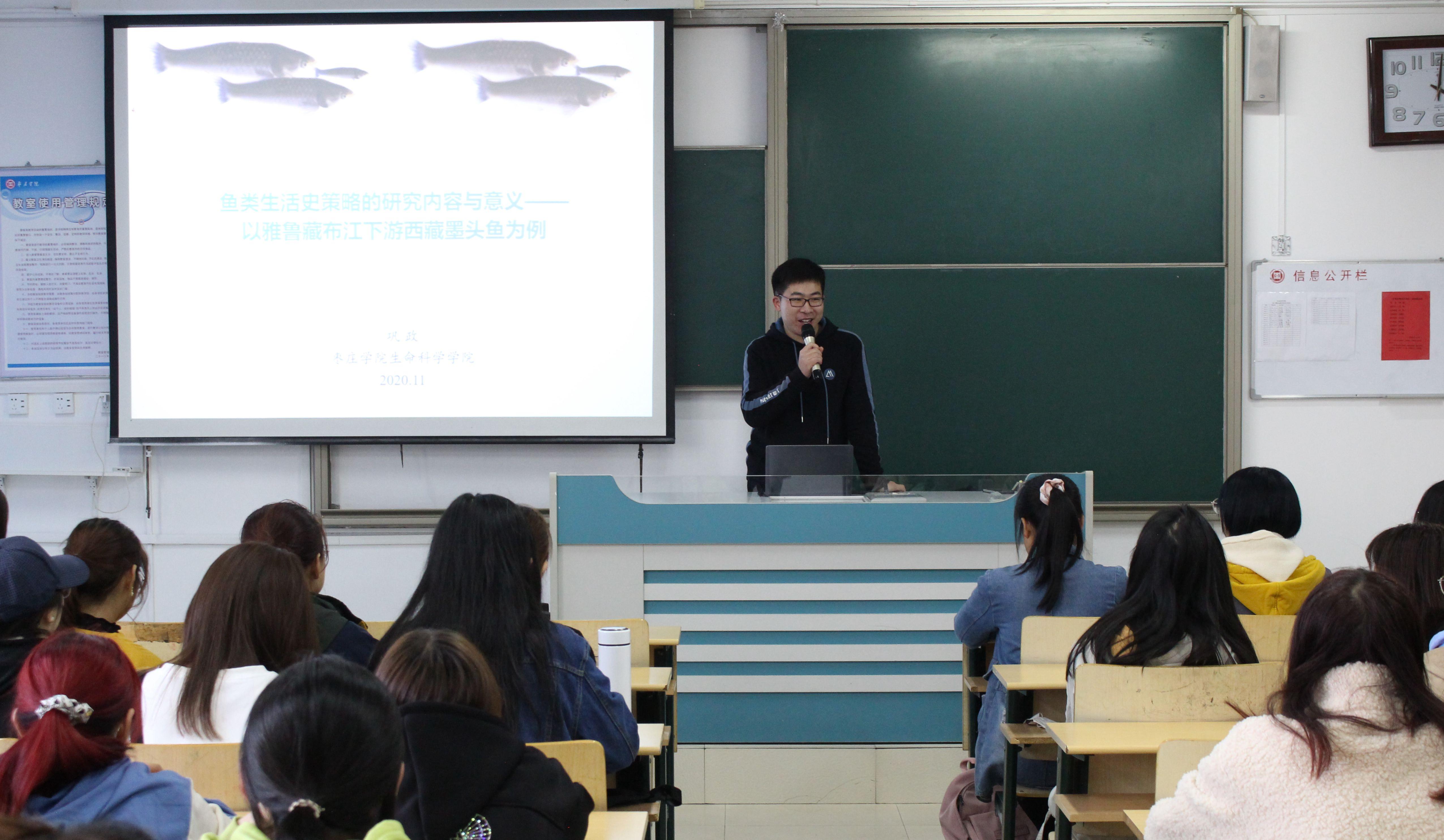 巩政博士从西藏墨头鱼的生活史策略、年龄与生长、摄食特征、繁殖生物学四个方面向学生讲解了鱼类如何进行繁衍,对环境变化如何响应以及鱼类在不同生活史阶级死亡和资源分配特征如何变化等问题。本次报告加深了学生鱼类生活史策略的认识,使学生受益匪浅。