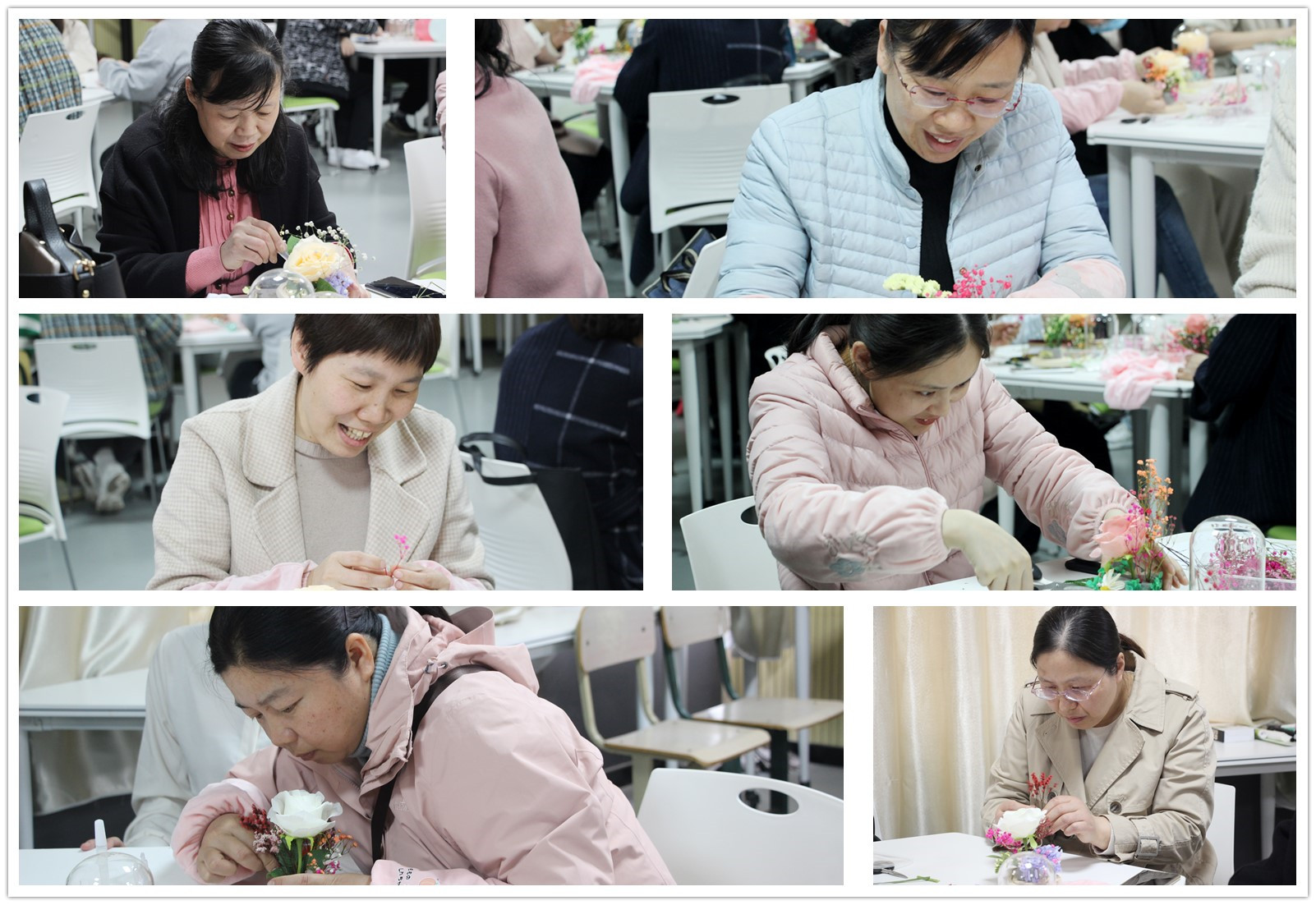 活动第二阶段进行永生花的制作,活动过程中,女教工们用自己灵巧的双手,将一朵朵经过精心挑选与修剪的花朵搭配出富有层次感、艺术感的造型。看着一朵朵栩栩如生的永生花从自己手里诞生,大家幸福之情溢于言表。