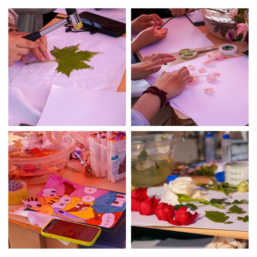 在活动过程中,同学们通过拓印技术,将植物的形态、颜色、脉络纹理转印在布料上。她们或独自操作,或相互合作,不断尝试不同的植物搭配与敲打方式,力求创造出独一无二的拓染作品。在创作过程中,他们沉浸在植物的世界里,不仅深刻体验到了植物的生命力,也找到了自我内心的宁静与平衡。现场氛围热烈而欢快,充满了艺术与创造的氛围。