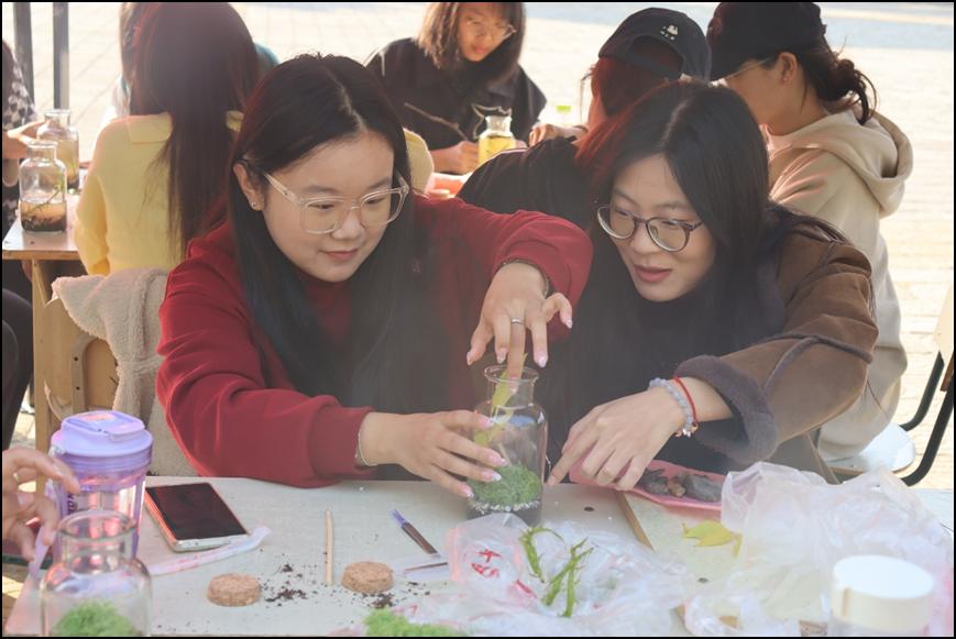 为培养学生的动手能力,提升同学们对于生物多样性价值的认识。10月23日下午生命科学学院在青年广场举办“微缩世界,宏观生态”——生态景观瓶制作活动。本次活动由校学生工作处主办,生命科学学院承办,有生命科学学院、心理与教育科学学院、化学化工与材料科学学院、光电工程学院等学院的同学参加。