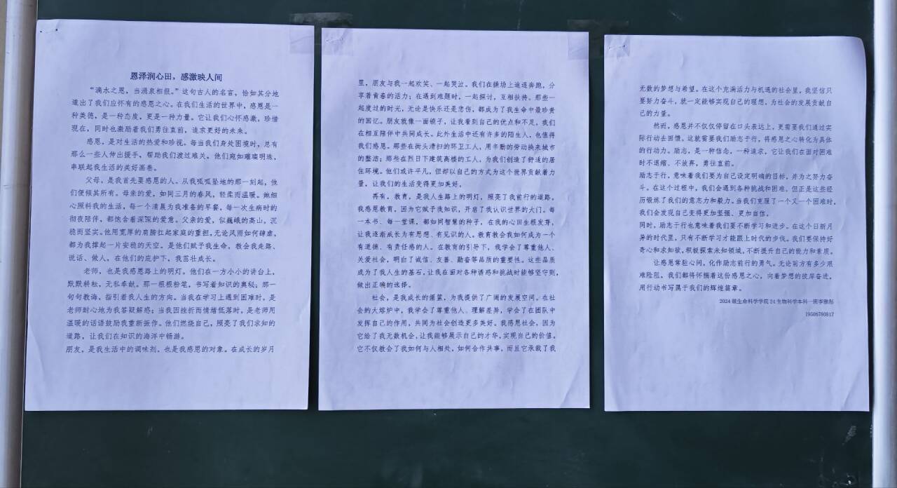 为激发学生的感恩情怀,传递正能量,鼓励学生通过文字表达内心的感激之情,弘扬感恩文化。2024年11月8日-11月10日,生命科学学院举办了“感恩于心,励志于行”征文比赛活动。