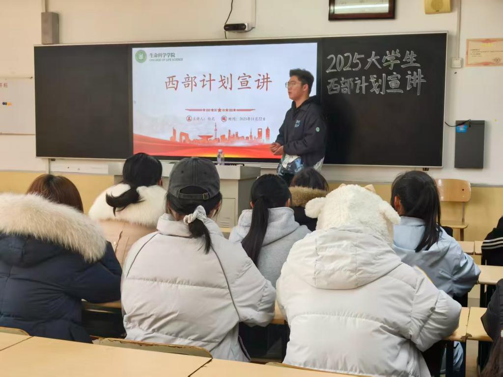 为引导学生树立正确的就业观、成才观,鼓励青年学子将个人理想融入国家发展大局,2025年11月29日,生命科学学院在理工楼2201举办了西部计划宣讲会。此次宣讲会特邀正在参加2025年大学生志愿服务乡村振兴计划滕州项目的我校2025届校友杨光主讲。