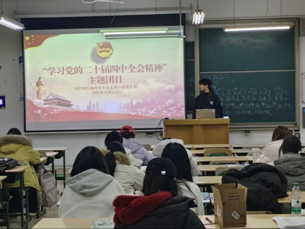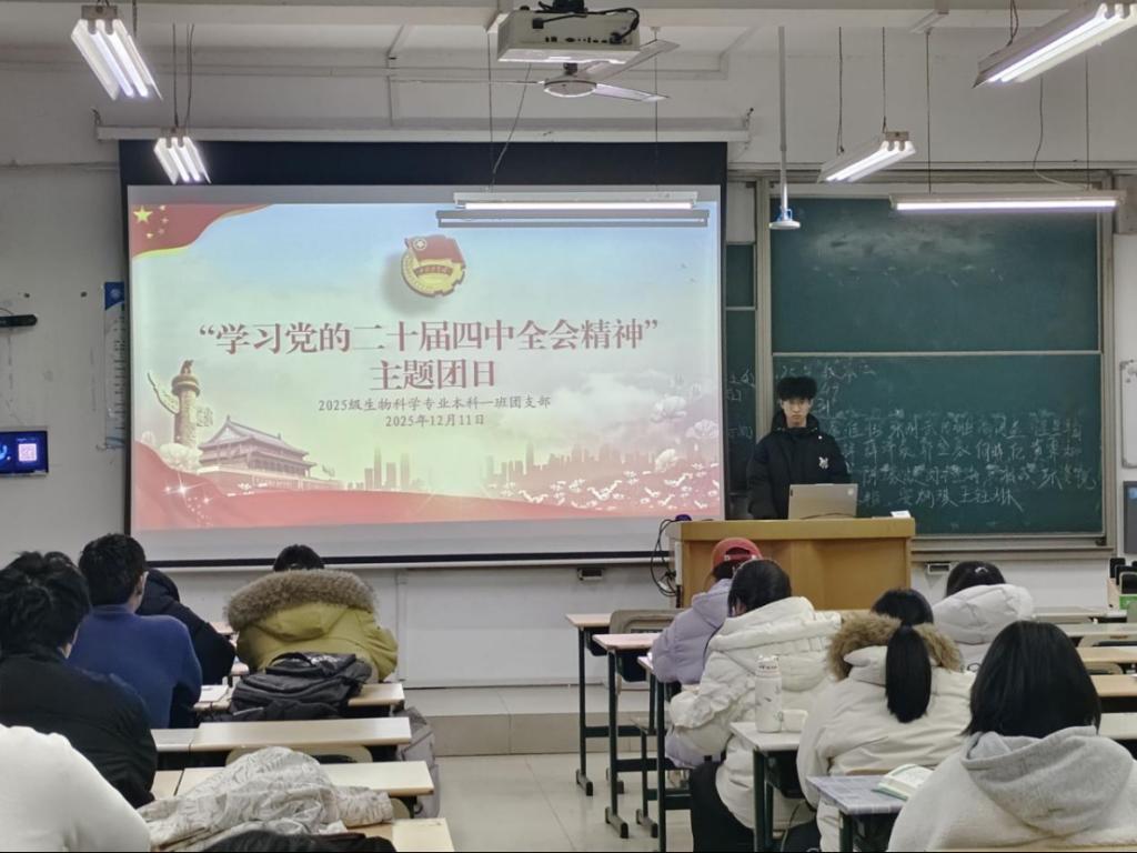 为深入学习宣传贯彻党的二十届四中全会精神,切实把广大青年的思想和行动统一到党中央决策部署上来,激发他们积极融入国家发展大局、为实现中华民族伟大复兴贡献青春力量,2025年12月11日,生命科学学院在理工楼组织各团支部开展“学习党的二十届四中全会精神”主题团日。