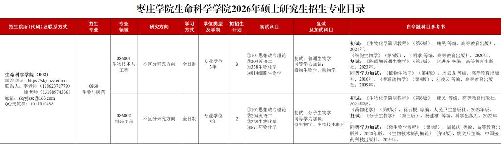 枣庄学院生命科学学院2026年硕士研究生招生专业目录